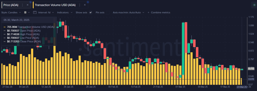 Attualmente, l’asset ha il potenziale per aumentare del 3%, il che significa che potrebbe facilmente raggiungere il livello di $0.736. Questa previsione si applica a un intervallo di tempo più breve. Tuttavia, su un intervallo di tempo più lungo, il grafico giornaliero di ADA suggerisce che un grande rally inizierà solo una volta che l’asset chiuderà una candela giornaliera sopra il livello di $0.85.